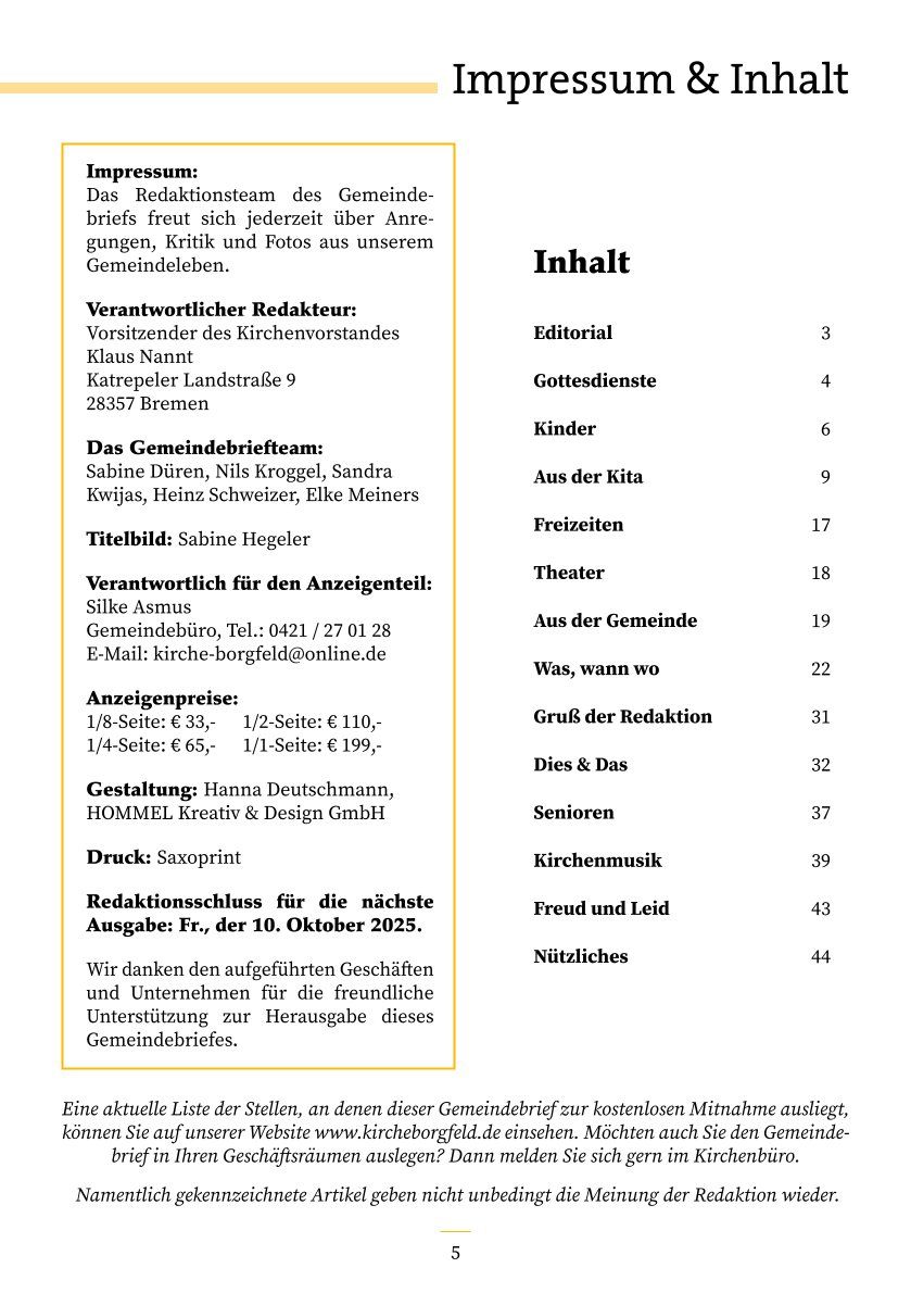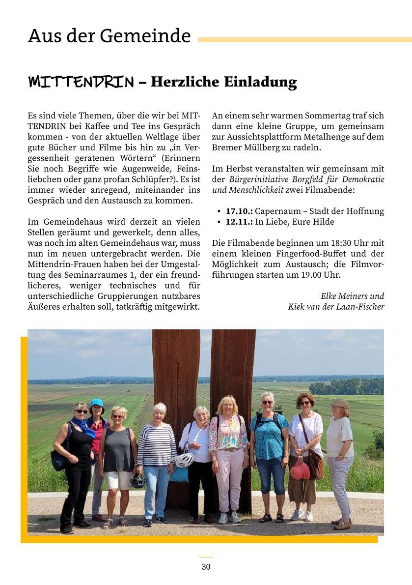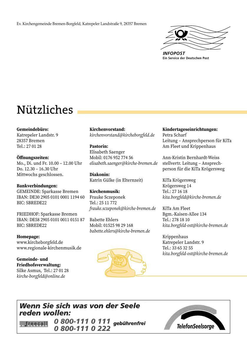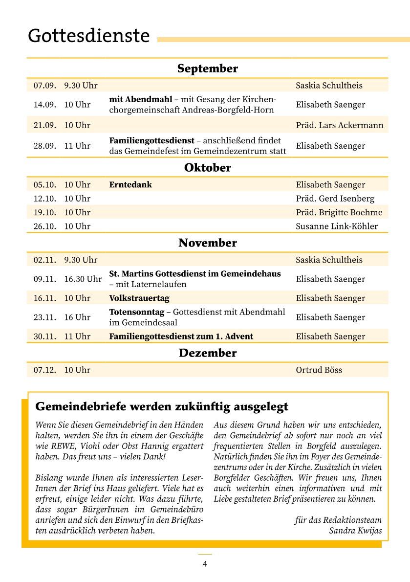 Bislang wurde Ihnen der Gemeindebrief ins Haus geliefert. Viele hat es erfreut, einige leider nicht. Was dazu führte, dass sogar BürgerInnen im Gemeindebüro anriefen und sich den Einwurf in den Briefkasten ausdrücklich verbeten haben. Aus diesem Grund haben wir uns entschieden, den Gemeindebrief ab sofort nur noch an viel frequentierten Stellen in Borgfeld auszulegen.